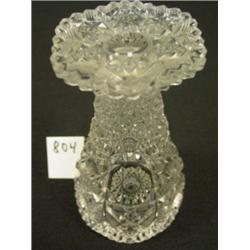 Pressed glass footed vase. Scalloped rim. All-over designs of hobstars, diamonds and crosshatching. Hexagonal foot has sawtooth edge (as does top edge). Marked "Deep Cut" under base. 6.25" tall and 3.5" wide at top. Condition: Excellent