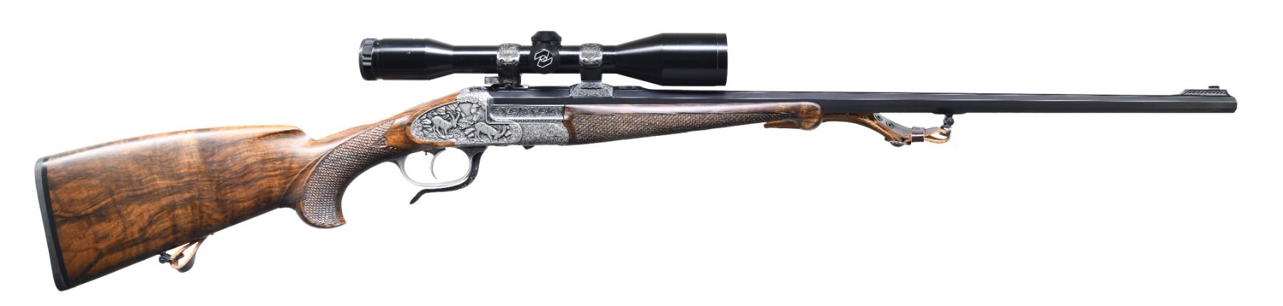 RIFLE BY H. SCHEIRING JR. OF FERLACH WITH SCOPE. Cal. 7mm Rem Mag. S# 197. This finely appointed rifle has 27" tapered octagon barrel with integral rib. Center portion of rib is milled away forming quarter rib and front sight ramp. Quarter rib is scroll engraved and fitted with QD scope bases and single folding leaf rear sight. Scroll engraved front ramp holds gold bead. Maker's name and address is on top of barrel. Barrel flats are stamped with Ferlach nitro proofs and caliber. Coin finished under lever opening Franz Jaeger type tipping locking block single shot action features non-automatic safety and set trigger. Action is engraved with nicely cut open shaded scroll surrounding deep relief game scene on bottom of a gold inlaid chamois in alpine terrain. Sideplates are also engraved with deep relief scenes but without gold. A roaring red stag and hind are in a clearing on left side. Right side depicts a pair of ibex on rocky mountainside. Engraving quality is quite good; no signature is found. Opening lever is blued and engraved with a monogram "MJB". Sculpted pistol grip buttstock made of very finely figured and marbled European walnut measures 14-1/4" over black rifle pad. Stock features humpback comb, fluted Tyrolian cheekpiece, chin strap transition to grip and carved fish scales in the place of checkering. Matching slim ejector forend with pronounced schnabled tip has Deeley release. There is a push button slide in iron to block ejectors from functioning. A brown leather sling with rubber backing is included. Rifle is fitted with Zeiss Diatal 6X scope with cross hair reticle in QD rings that are engraved matching action. UNATTACHED ACCESSORIES: import papers and some other advertising showing pictures of this type of rifle. CONDITION: exceptionally fine, very close to "As New" with only a very few handling and assembly marks in all fine factory finishes. Bore is bright and shiny. Mechanically fine. Set trigger needs adjustment. Scope is fine with some scratches and marks on tube from repositioning in rings; optically clear. (25-1525/MGM). MODERN. $6,000-10,000.