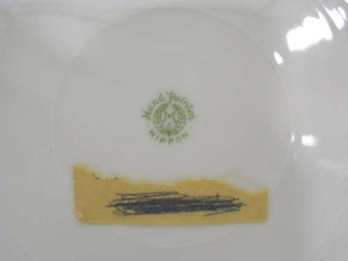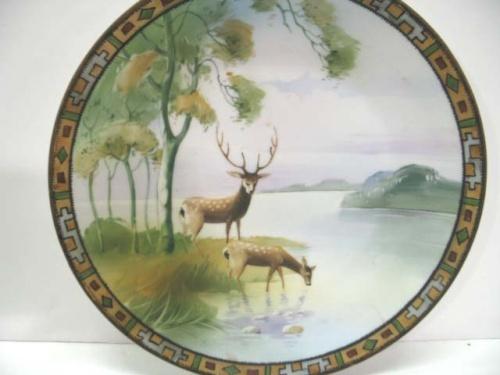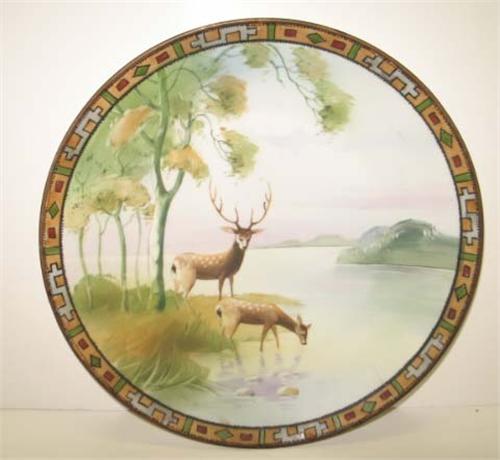 DEER DECORATED NIPPON PLATE. Decorated with hand painted stag and doe near pond. Enameled decoration around outer rim. Marked on bottom with Nippon green wreath mark. 10” Dia.