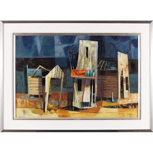 <B>DEFORREST JUDD (1916-1992)</B></I><BR><I>Ghost Town,</B></I> 1954<BR>Oil on masonite<BR>24in. x 36in.<BR>Signed and dated lower right<BR>Signed and titled verso<BR><BR>It is fortunate to have not one but two DeForrest Judd masterpieces in this auction. Such different pictures, but each so Texas. This one is a modernist version of a ghost town.<BR><BR>Judd leaves out certain details and emphasizes others. The background and sky are purely decorative with a flattened perspective. The foreground is also decorative and fractured into planes. The regionalist flavor is still present, but a more modern post-regionalist approach is an equal partner in the composition.<BR><BR>Exhibited:<BR>Dallas Museum of Fine Arts; 1955 Art Rental Collection<BR><BR> <B>Condition Report:</B> Excellent condition. Period frame in excellent condition.<BR><BR><b>Shipping:</b> Requires 3rd Party Shipping (<a target="_blank" href="http://www.heritageauctions.com/common/shipping.php">view shipping information</a>)