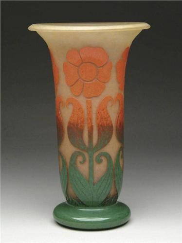 DEGUÉ FRENCH CAMEO VASE. Art Deco stylized floral decoration with vivid orange flowers shading to green stems and leaves on maize colored mottled background. Nice example. Acid-etched signature "Degué" on the foot. SIZE: 15-3/4" t. CONDITION: Very good to excellent. 5-62407