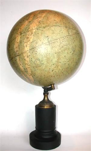 DELAMARCHE.- Globe céleste. Paris, Delamarche, s.d. [c. 1850]. Globe monté sur socle de bois peint noir, méridien gravé en métal (diamètre 30 cm, hauteur 58 cm; retouches le long de l'équateur).