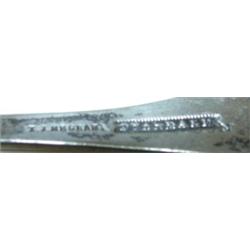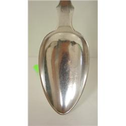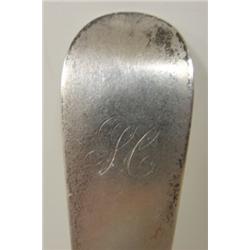 DELAWARE COIN SILVER TABLE SPOON. Marked on reverse of handle "T.J. Megear". Monogrammed "H" on front of handle. 7" L