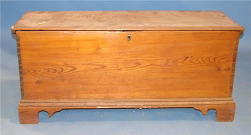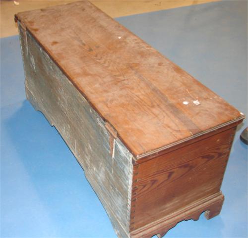 DELAWARE HEART PINE DOVETAILED BLANKET CHEST. Bracket feet with rooster claws. Dovetailed construction. Till in interior. Replaced hinges. 20.5” H, 45” W, 16” D