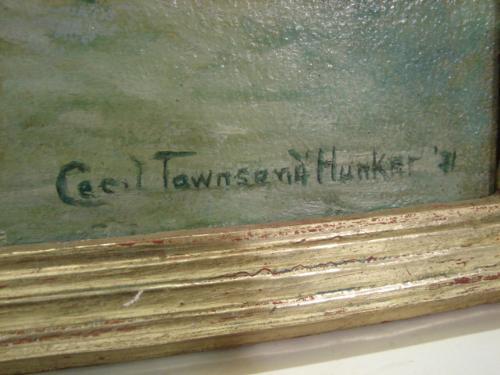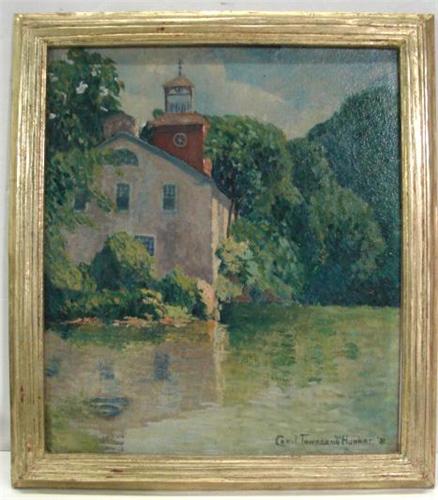 DELAWARE ‘ALONG THE BRANDYWINE’ OIL ON BOARD PAINTING. Depicts a mill along the Brandywine River. Signed in lower right “Cecil Townsend Hunker ‘31”. Retains original gallery label from the Wilmington Society of Fine Arts on verso with title of painting and artist’s information. 18.5” x 16.5” framed.