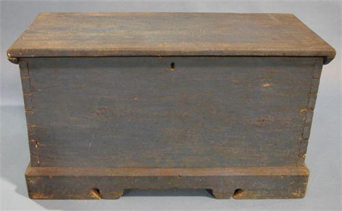 SUSSEX COUNTY, DELAWARE BLUE PAINTED PINE BLANKET CHEST. Cut-out feet at front. Dovetailed construction. Till in interior. Original hardware. 17.75” H, 32” W, 15.5” D