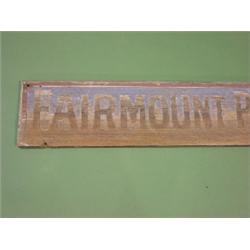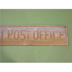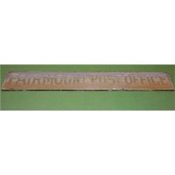 FAIRMOUNT, DELAWARE POST OFFICE SIGN. Blue & red original paint. Shows signs of wear and loss to paint. 10” H, 60” L