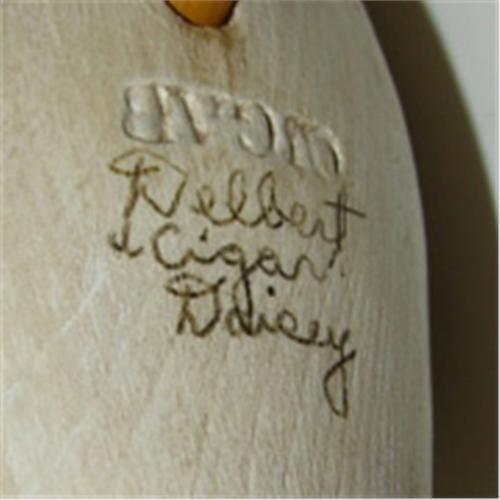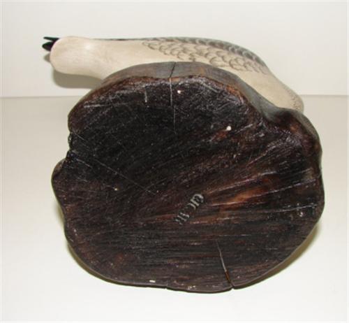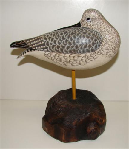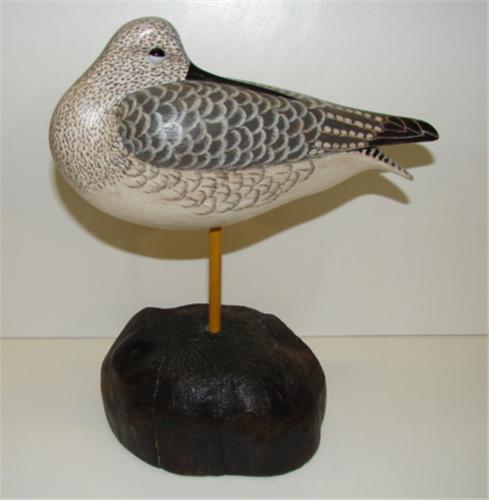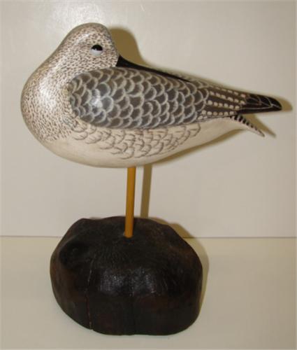 DELBERT "CIGAR" DAISEY, CHINCOTEAGUE, VIRGINIA, PREENING SHOREBIRD CARVING. Has wooden stand. Bottom of stand and bird are stamped "CIGAR" and bottom of bird is signed "Delbert/Cigar/Daisey". 9" H
