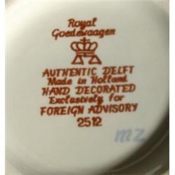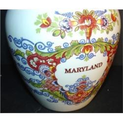 DELFT "MARYLAND" COVERED CANISTER. Body is decorated with floral decoration and is marked "Maryland". Marked on bottom "Royal Goedewaagen-Authentic Delft-Made in Holland-Hand Decorated exclusively for Foreign Advisory-2512". Brass lid. 8" H to top of finial.