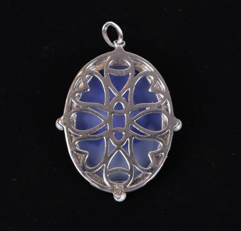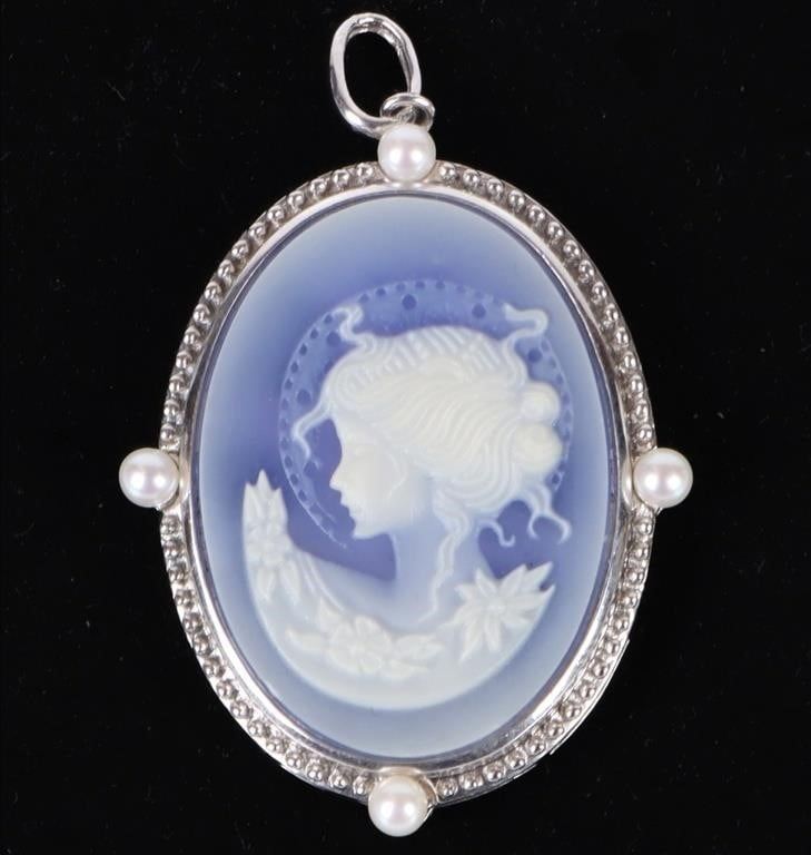 Delicate porcelain cameo sterling silver pearl ladies pendant.
