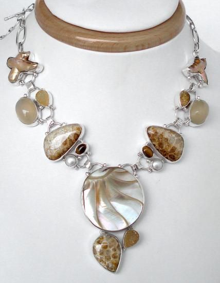 DELIGHTFUL ARTISAN BLISTER PEARL FOSSIL CORAL DRUZY AND STERLING SILVER NECKLACE, Measures 14 - 19 inches, Details Blister Pearl 32mm, Fossil Coral 15x20mm, 14x23mm Pear Cab, Honey Druzy 7x10mm, 7x10mm Pear Cab, Rainbow Moonstone 12x16mm Oval Cab, Gold Biwa Pearl 20x24mm, 16x21mm, Tigers Eye 7x5mm Oval Cab, Pearl 6mm Round Cab, HEAD SIZE: 2 1/8"