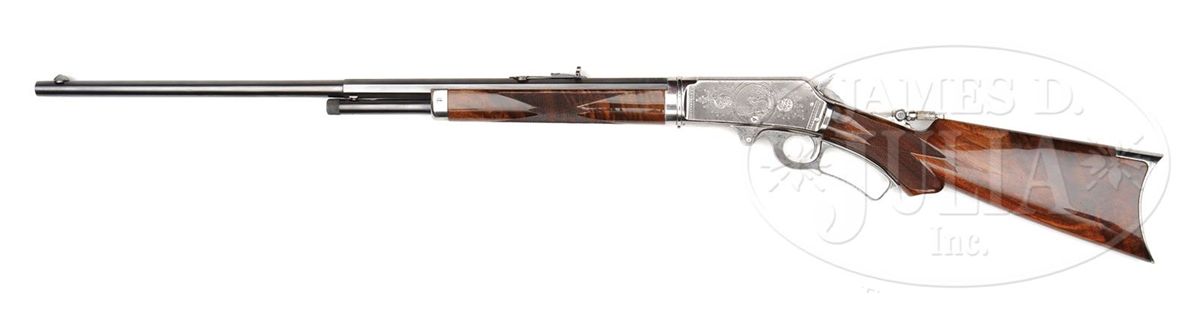 SN 294980. Cal. .32 Spcl. Deluxe special order rifle with 26" oct to rnd bbl, 1/2 magazine, ivory bead hunting front sight missing the bead, folding semi-buckhorn rear sight and a locking Lyman combination tang sight. Mounted with nicely figured, center crotch flame grain American walnut with B-style checkered forearm and serpentine grip buttstock with crescent buttplate. Left side of the upper tang, under the wood has the matching SN. Top tang channel of buttstock appears to have matching SN, but the area is dark and oil stained and partially obliterated. Buttplate has the number 294980. Receiver, lever, hammer, takedown ring and buttplate are nickel plated. Receiver is engraved in style #1, probably by Conrad Ulrich, with the vignette of a standing whitetail buck in a forest scene on the left side, surrounded by foliate arabesque patterns, with matching patterns on the right side, top and bottom, top tang and bbl boss. CONDITION: Very good. Bbl and magazine tube retain about all of a restored finish with the cal. marking restamped. Receiver and all of the metal parts retain most of their restored nickel finish with fine pitting on the receiver and lever. Wood is sound and retains about all of a bright restored finish. Mechanics are fine, bright shiny bore. 4-49343 JR260