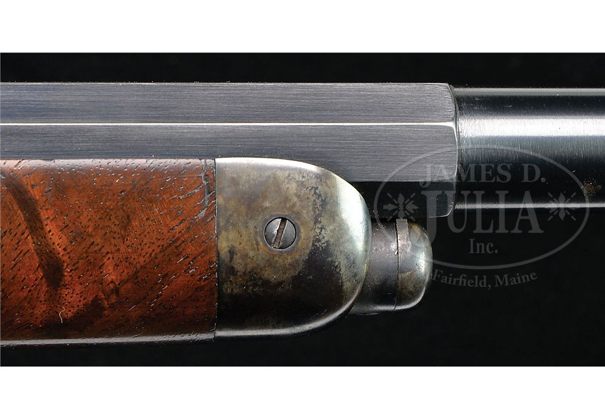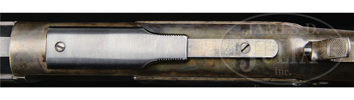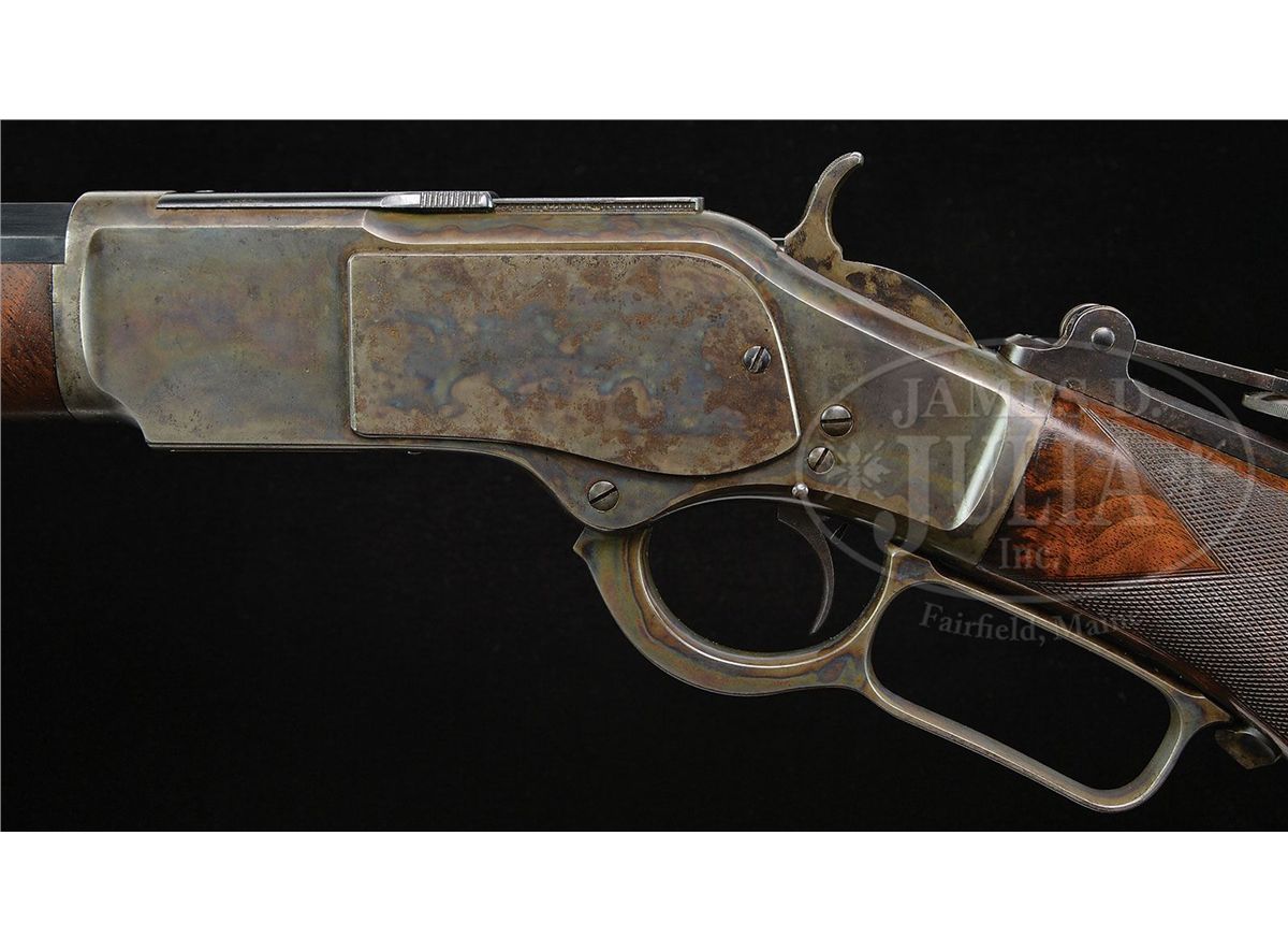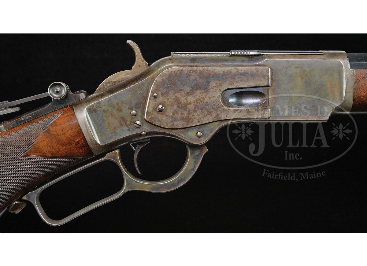 SN 85007. Cal. 44 WCF (44-40). Fine special order 2nd model rifle with 24-1/4" oct to rnd bbl, button mag, German silver Rocky Mountain front sight, semi-buckhorn rear sight and a thick base adjustable tang sight with 4" staff. Receiver has screwed-on dust cover rail with 3rd type dust cover and also has single-set trigger. Mounted with 2-3X, highly figured American walnut with H-style checkered forearm and black insert serpentine grip buttstock that has crescent buttplate with trap. Left side of lower tang, under the wood, is marked "XX" and assembly number "4202". Matching assembly number is found in the top tang channel of buttstock and inside toe of buttplate. Accompanied by a Cody Firearms Museum letter which identifies this rifle with 1/2 oct bbl, set trigger, 1/2 magazine, checkered stock with pistol grip and case hardened, received in warehouse Apr 12, 1882 and shipped the same day to order #32276. Given that this rifle was produced in 1882 which was the height of the great westward expansion of Manifest Destiny, while the Indian Wars were still underway and repeating firearms were in great demand it is very probable that this rifle may have gone west with a pioneer or could possibly have been used by and outlaw or member of law enforcement on the frontier. Firearms of that era usually saw very hard service under harsh circumstances and are rarely found with high original finish. CONDITION: Very fine, all original. Bbl retains about 96-97% strong original blue with 3 or 4 scattered small spots of fine pinprick pitting and wear primarily on the sharp edges. Receiver retains most of its orig case colors, moderately faded with some fine surface etching on the right side plate. Lever retains about all of its orig case colors, strong and bright on the sides, moderately faded on the outer faces. Hammer retains strong case colors. Buttplate retains about all of its very strong case colors, turned a little silver on the tang. Wood is sound with a few scattered light nicks and scratches and retains about 96-97% bright orig piano varnish finish on the buttstock and about 60% on the forearm with the balance turned dull from hand wear. Checkering shows light to moderate diamond point wear. Mechanics are crisp, brilliant shine bore, may have been fired, but if so, very little. Bolt face and loading gate retain most of their orig finish. 4-49303 JR240