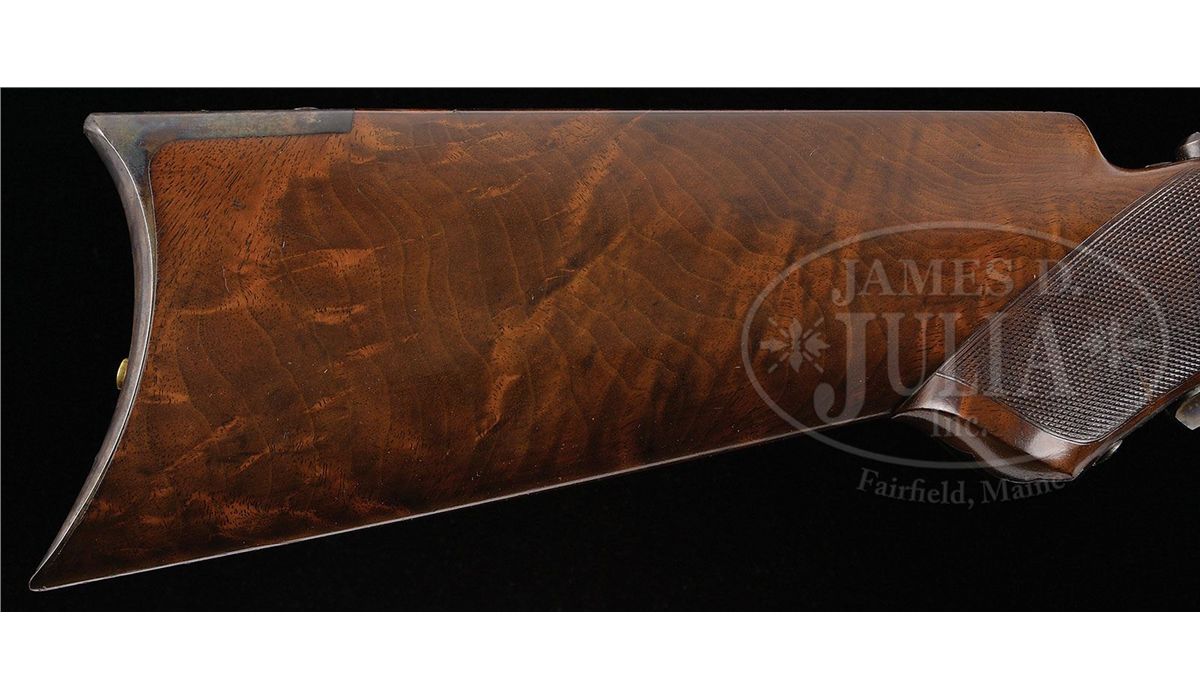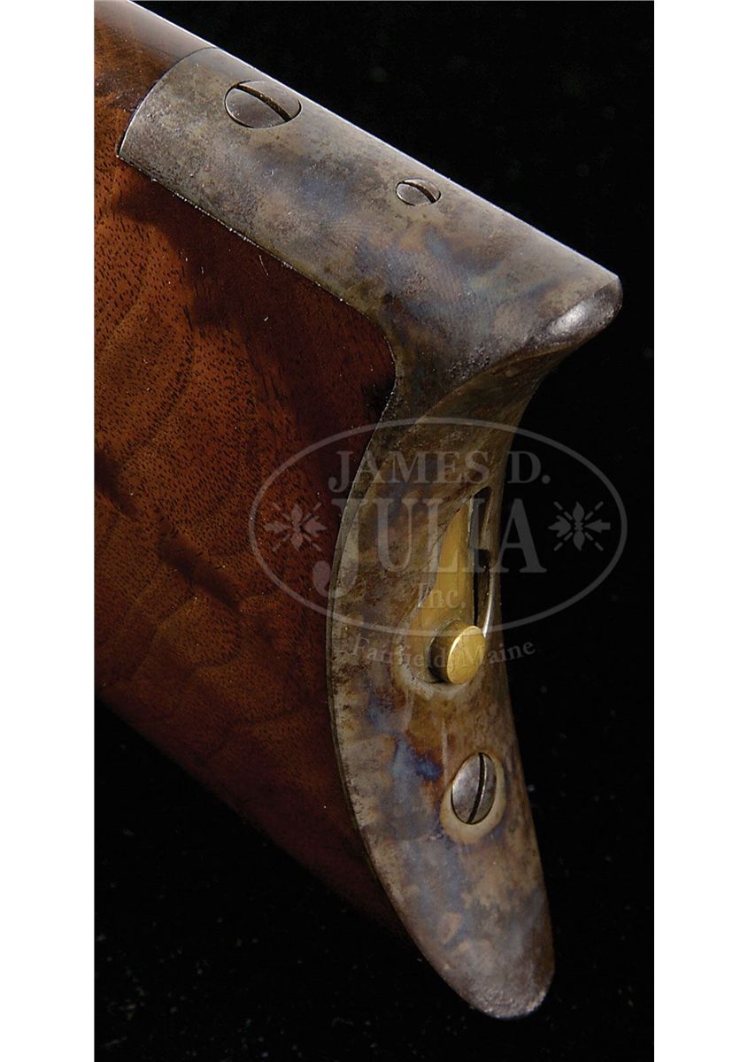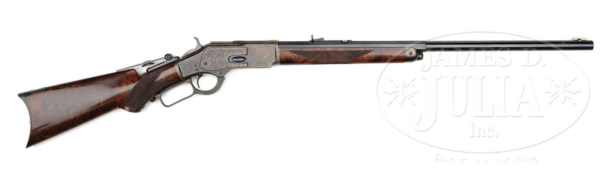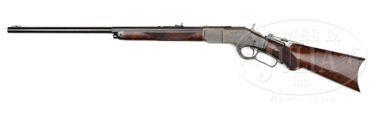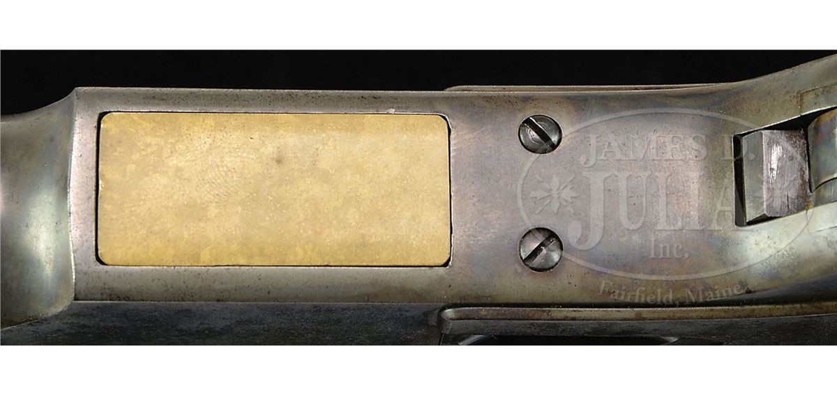 SN 85007. Cal. 44 WCF (44-40). Fine special order 2nd model rifle with 24-1/4" oct to rnd bbl, button mag, German silver Rocky Mountain front sight, semi-buckhorn rear sight and a thick base adjustable tang sight with 4" staff. Receiver has screwed-on dust cover rail with 3rd type dust cover and also has single-set trigger. Mounted with 2-3X, highly figured American walnut with H-style checkered forearm and black insert serpentine grip buttstock that has crescent buttplate with trap. Left side of lower tang, under the wood, is marked "XX" and assembly number "4202". Matching assembly number is found in the top tang channel of buttstock and inside toe of buttplate. Accompanied by a Cody Firearms Museum letter which identifies this rifle with 1/2 oct bbl, set trigger, 1/2 magazine, checkered stock with pistol grip and case hardened, received in warehouse Apr 12, 1882 and shipped the same day to order #32276. Given that this rifle was produced in 1882 which was the height of the great westward expansion of Manifest Destiny, while the Indian Wars were still underway and repeating firearms were in great demand it is very probable that this rifle may have gone west with a pioneer or could possibly have been used by and outlaw or member of law enforcement on the frontier. Firearms of that era usually saw very hard service under harsh circumstances and are rarely found with high original finish. CONDITION: Very fine, all original. Bbl retains about 96-97% strong original blue with 3 or 4 scattered small spots of fine pinprick pitting and wear primarily on the sharp edges. Receiver retains most of its orig case colors, moderately faded with some fine surface etching on the right side plate. Lever retains about all of its orig case colors, strong and bright on the sides, moderately faded on the outer faces. Hammer retains strong case colors. Buttplate retains about all of its very strong case colors, turned a little silver on the tang. Wood is sound with a few scattered light nicks and scratches and retains about 96-97% bright orig piano varnish finish on the buttstock and about 60% on the forearm with the balance turned dull from hand wear. Checkering shows light to moderate diamond point wear. Mechanics are crisp, brilliant shine bore, may have been fired, but if so, very little. Bolt face and loading gate retain most of their orig finish. 4-49303 JR240