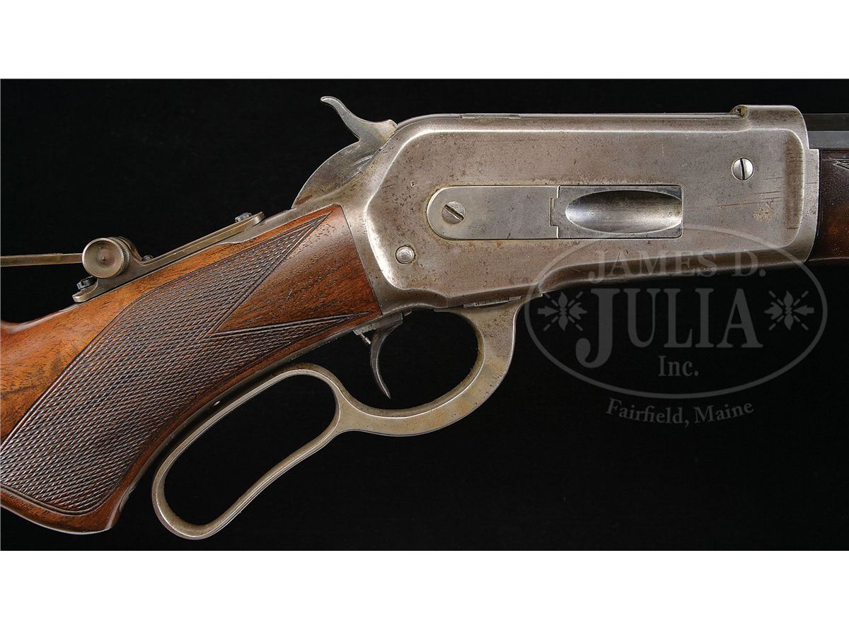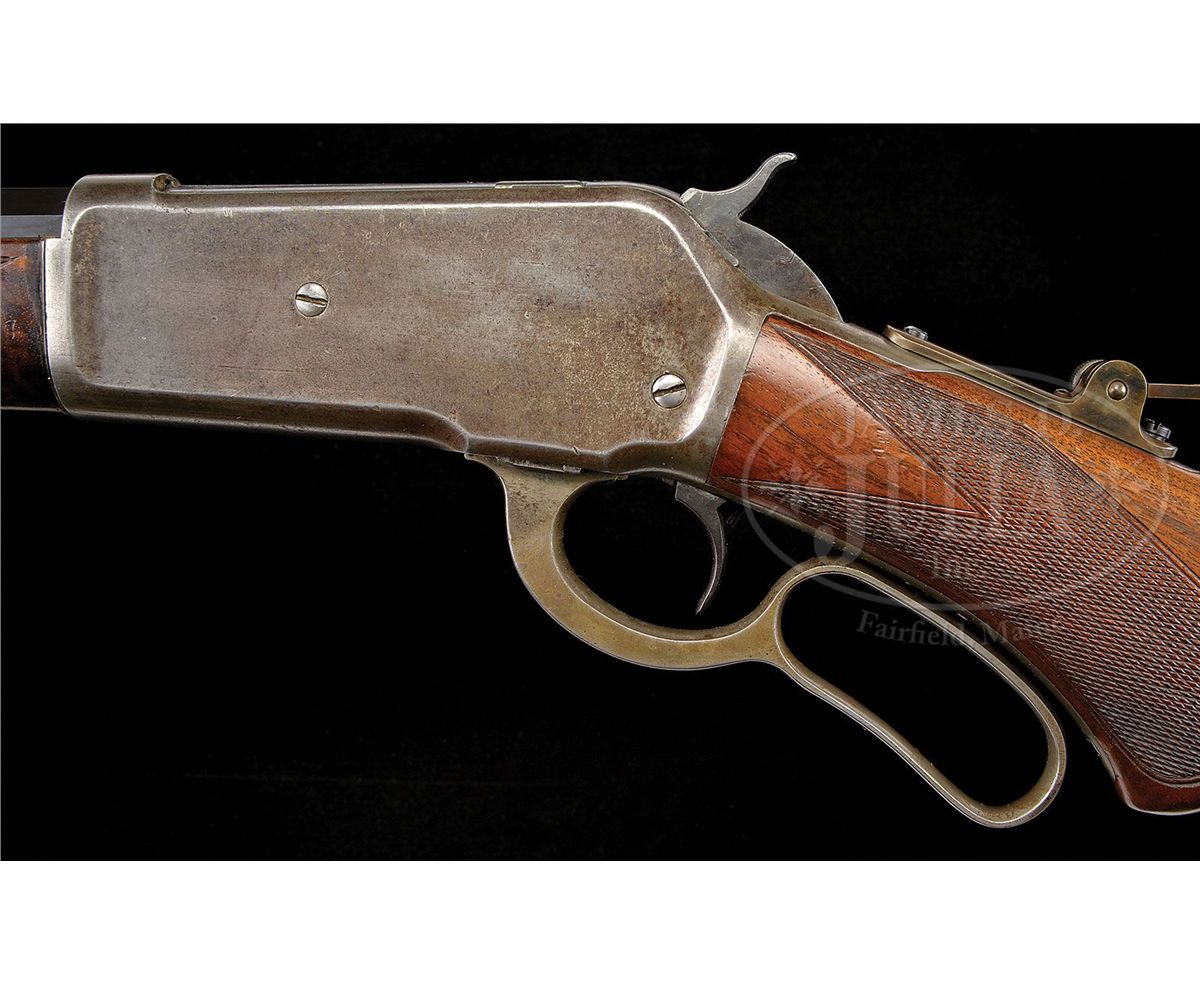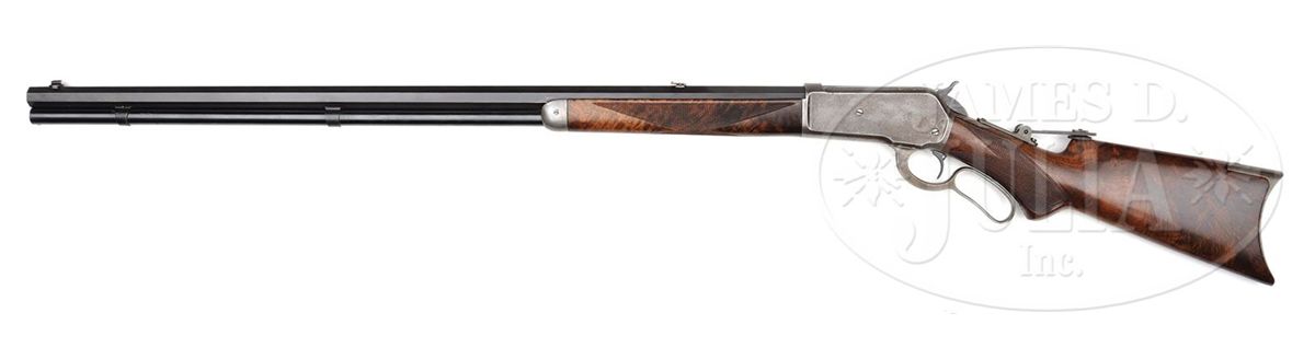 SN 36140. Cal. 40-82. Fine, deluxe 86 rifle with 32" heavy oct bbl, full magazine tube with 2 bands, gold bead jack front sight, Lyman 6A 2-leaf folding rear sight & a reproduction thin base adjustable tang sight with 2-3/4" staff. Receiver has single set trigger. Mounted with replacement highly figured, center crotch, burl & flame grain American walnut with H-style checkered forearm and serpentine grip buttstock that has crescent buttplate. Left side of lower tang is marked "XX" & the assembly number "226". Matching assembly number is found inside toe of buttplate. Buttstock is a modern replacement and is unmarked. Bbl is also a modern replacement by a very competent gunsmith. CONDITION: Very fine. Bbl & magazine tube retain about all of their crisp, custom Winchester-style finish. Receiver retains traces of silvered case colors being mostly a grey brown patina. Wood is sound & retains about all of its fine custom finish. Mechanics are fine, bright shiny bore. Would make an outstanding cowboy action shooter. 4-49333 JR239