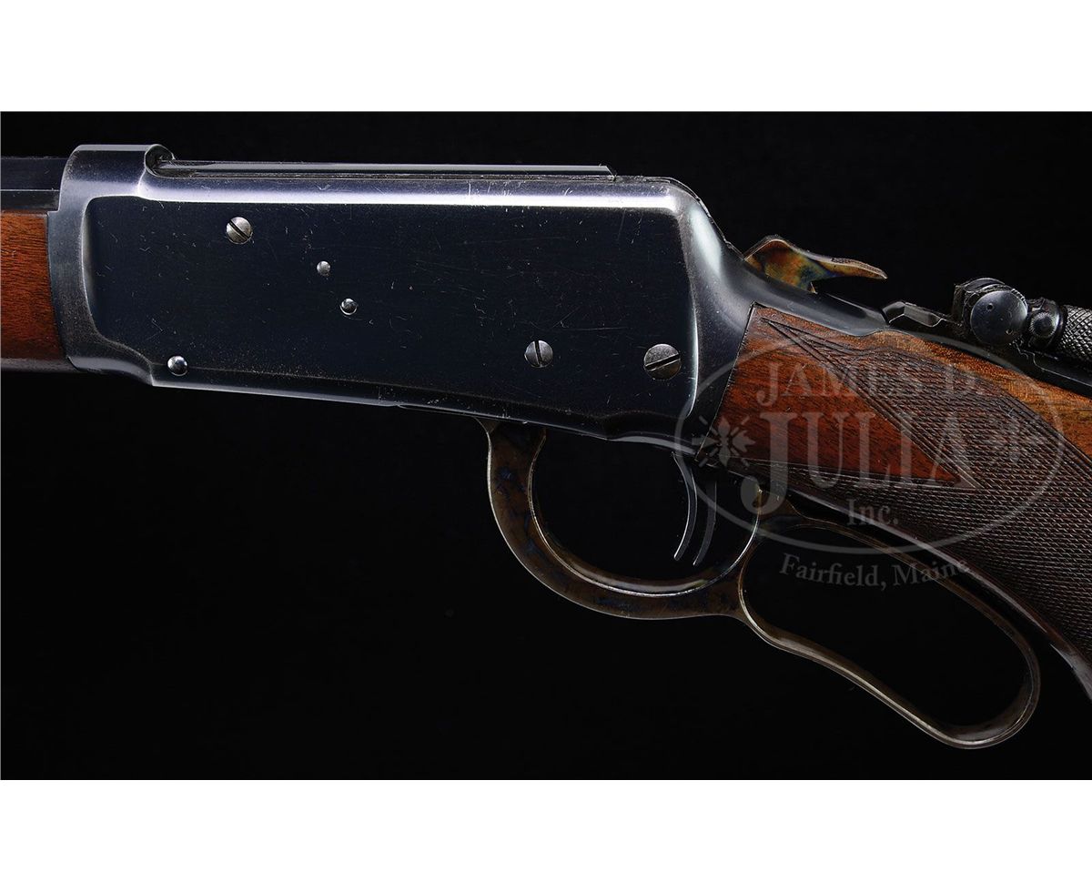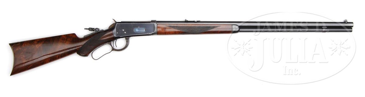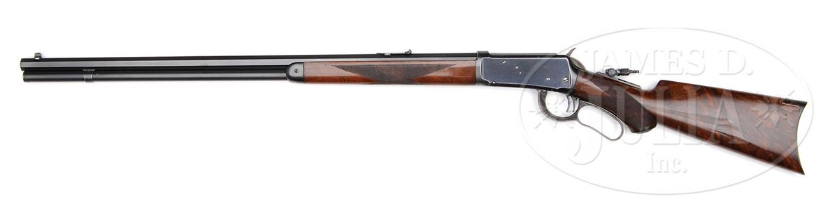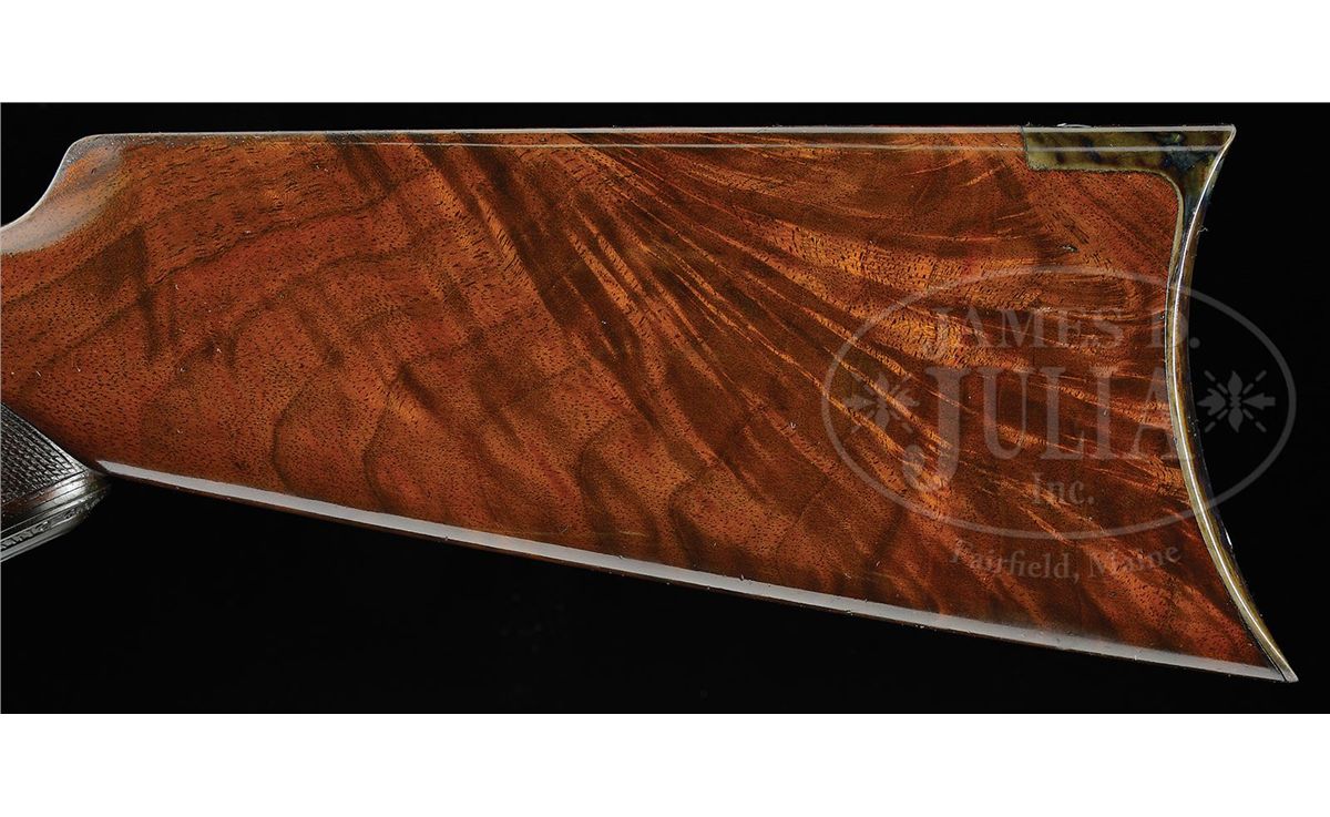 SN 213667. Cal. 32 WS. Beautiful deluxe '94 with 26" oct bbl, full magazine, Lyman ivory bead front sight, 3-leaf platinum line express rear sight and a locking Lyman combination tang sight. Receiver has close-coupled dbl-set triggers. Left side of lower tang, under the wood, is marked with assembly number "18618" and "XXX". Matching assembly number is also found on rear face of buttstock and inside toe of buttplate. Mounted with beautiful flame & shell grain American walnut with H-style checkered forearm and capped pistol grip stock with crescent buttplate. Accompanied by a Cody Firearms Museum letter identifying this rifle, as found, with dbl set triggers, received in warehouse June 22, 1904 and shipped next day to Order #234031. PROVENANCE: Wes Adams Estate Collection. CONDITION: Very fine. Bbl & magazine tube retain 97-98% strong orig blue with only faint sharp edge wear; receiver retains 95-97% strong orig blue with sharp edge wear and thinning around the front; lever & hammer retain brilliant case colors, faded on outer faces of lever; buttplate retains about 70% brilliant case colors with a cleaned area in the center. Wood is sound and retains most of a very fine professionally restored finish. Mechanics are crisp, bright shiny bore. 4-44379 JR19