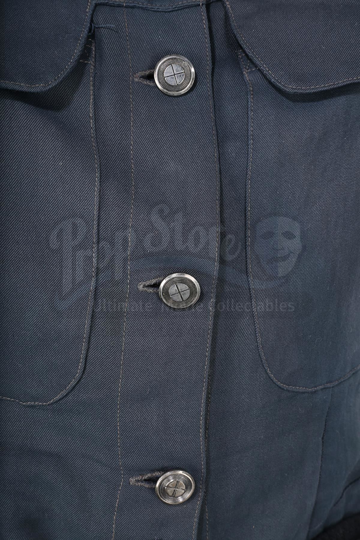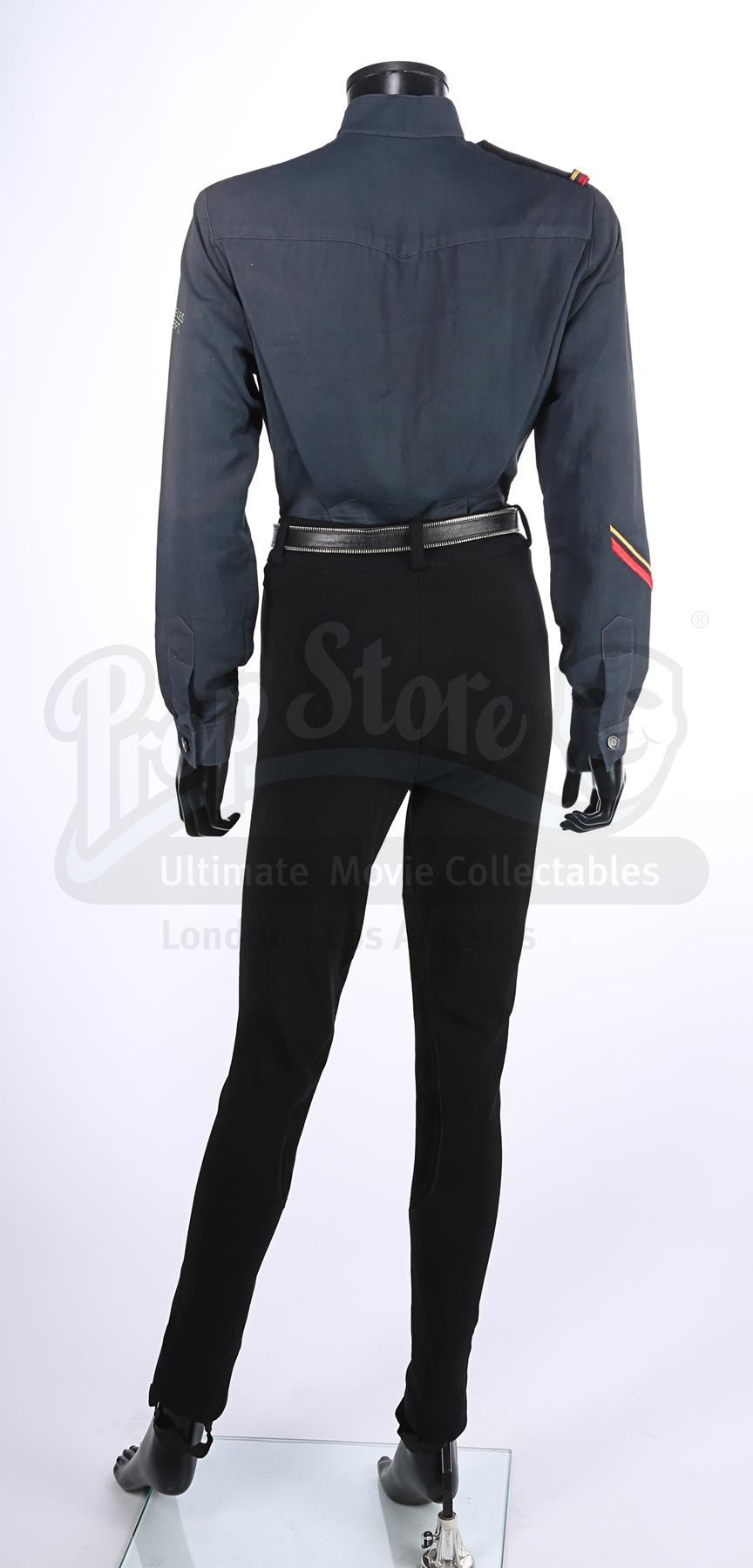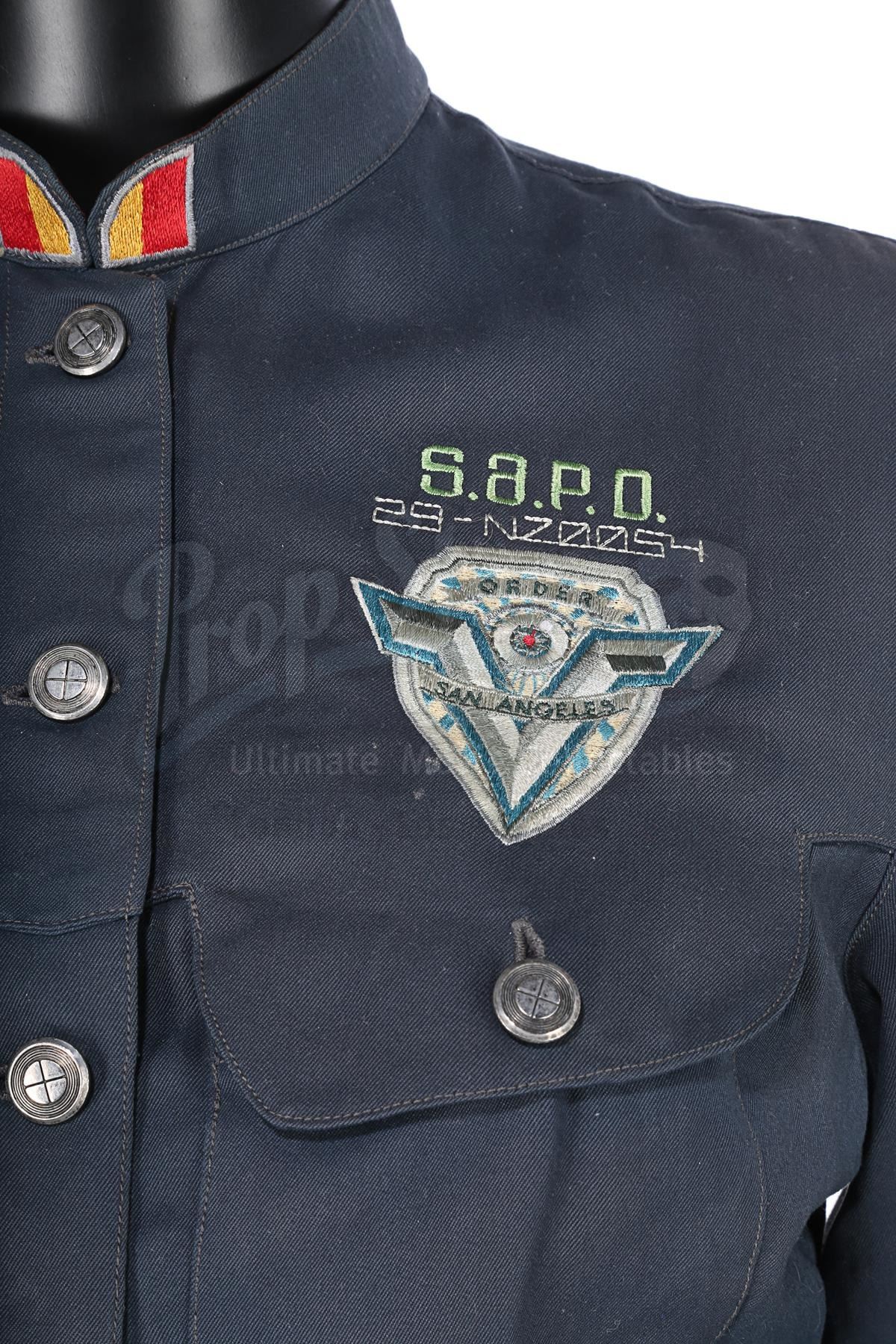 The uniform consists of a navy button-up shirt, a pair of trousers with elastic stirrups, and a faux-leather belt with a metal zip-like trim. The shirt features multiple embroidered emblems, and a champagne-coloured piece of fabric is sewn to the back hem. A Warner Bros. barcode is adhered to the shirt lining, and the collar displays the handwritten text "TC, Tracy Cocco [sic]", referring to Tracee Cocco, an uncredited performer who played one of the SAPD headquarters' police officers. The shirt has become discoloured around the shoulders and shows minor wear from production use.