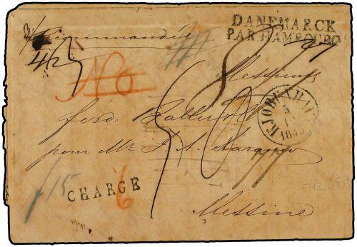 1845 (Dec 5) Entire letter, some splitting inside, sent registered from Copenhagen to Messina, Sicily. Unusual usage with fine ´Charge´ and two line ´DANEMARCK/PAR HAMBOURG´ in black, Hamburg Thurn & Taxis PO transit cds and two line dated arrival (Dec 30) in red on reverse. Multitude of manuscript rates. Rare registered usage and a rare destination at this date.