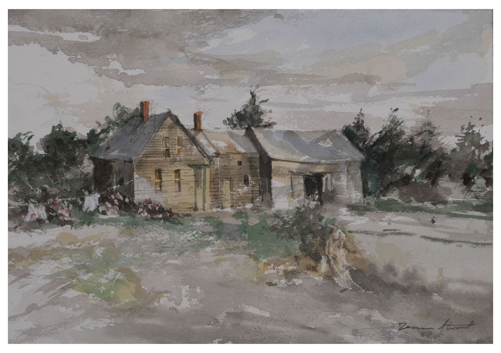 Original watercolor on paper by Connecticut artist Dennis Stuart, titled "Homestead" and located to Maine. Unframed. Signed at LR with serial number hand written verso. Sheet measures 7" x 10".
