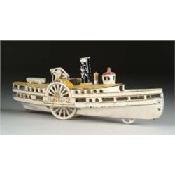 DENT ADIRONDACK PADDLE WHEEL BOAT. A fine cast iron boat in enameled white paint with yellow, black red & gilt trim. SIZE: 15” l. CONDITION: Overall is very fine; heavy flaking to black paint on smokestack. JL 1-4401 (750-1,000)