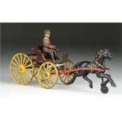 DENT CHIEF’S WAGON. Desirable fire toy that is seldom found. The chief’s cart, which is all iron, would have a driver racing off to the fire. Painted in dark brown with gold trim and yellow wheels. SIZE: 11-1/2” l. CONDITION: Half of front kickboard on cart broken and missing, replaced driver. Paint condition overall very good plus. JL 1-4414 (300-500)