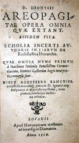 DENYS l'Aréopagite.- Opera omnia quae extant. Eiusdem vita. Scholia incerti authoris in librum de Ecclesiastica Hierarchia. Lovanii [ Louvain], apud Hieronymum Wellaeum, 1566. In-8° : [14]-294 ff. (faibles taches à la marge infér. des premiers ff.) Rel. de l'époque : plein veau, plats à encadrements de filets à froid, fleurons de coins et central dorés, dos à nerfs (traces de cordons, dos refait, pièce de titre et gardes renouvelés).
