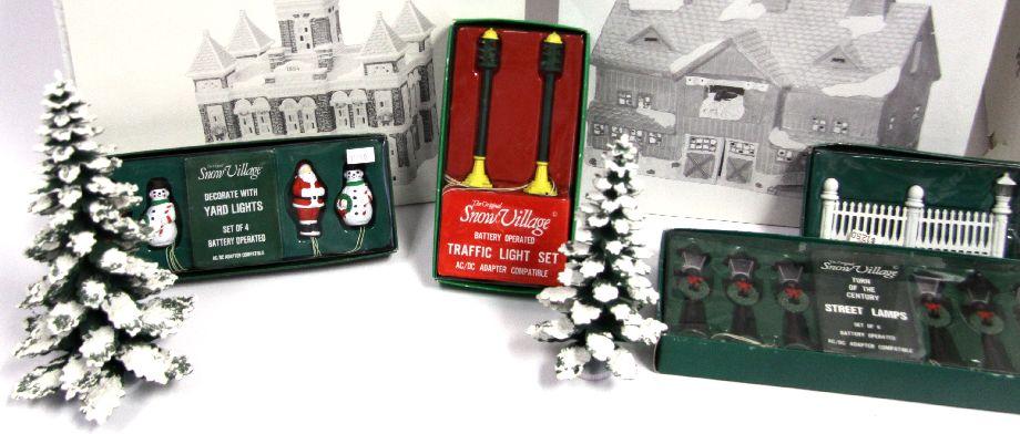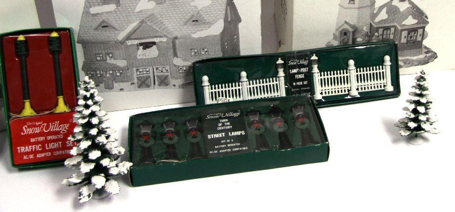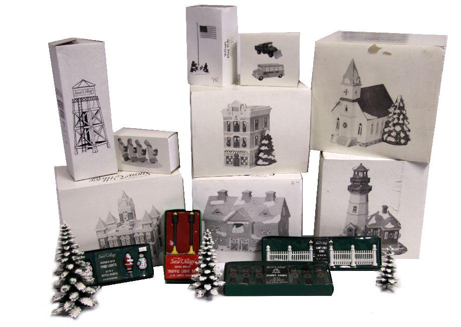 Grouping includes County Courthouse 5144-6, Red Barn 5081-4, Toy Shop 5073-3, Traffic Light Set 5500-0, Decorate with Yard Lights 5416-0, Lam Post Fence 5506-9, Street Lamps 5505-5, Choir Kids 5147-0, Village Flag Pole 5177-2, School Bus and Snow Plow 5137-3, Water Tower Accessory 5133-0, 3 Trees, Christmas Cove Lighthouse 5438-6 and All Saints 5070-9.