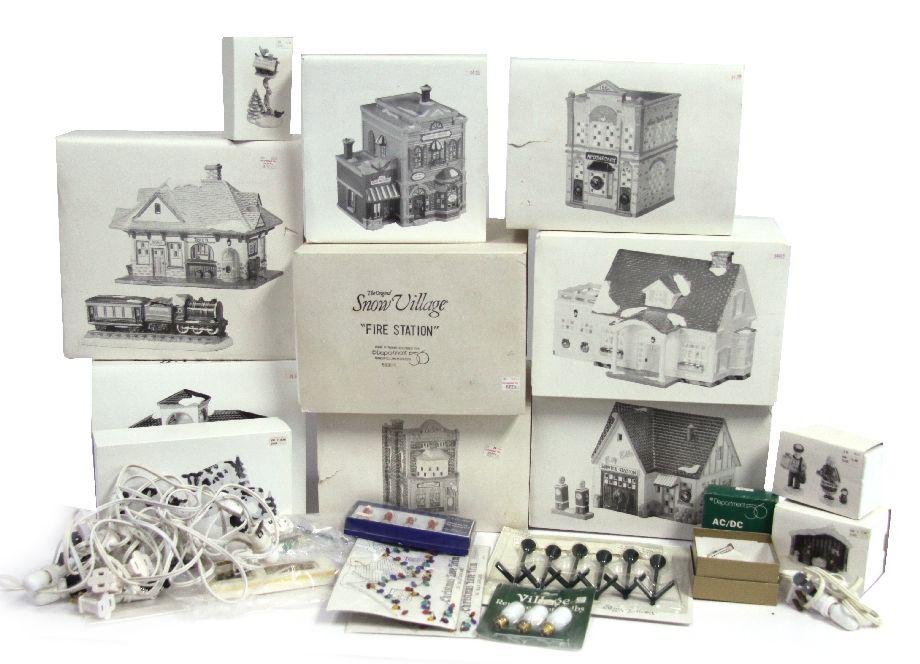 Grouping includes Jefferson School 5082-2, Service Station 5128-4, Antique Shop 5123-3, Fire Station 5091-1, Village Station and Train 5122-5, North Creek Cottage 5120-9, Village Realty 5154-3, Apothecary 5076-8, Candles by the Door Step 5206-0, three House for Sale Signs, A Herd of Holiday Heifers 5455-0, Street Sign Accessory 5167-5, two Christmas Eave Trim 5511-5, Outdoor Nativity Scene 5137-7, AC/DC Adapter, Replacement Bulbs, Girl Selling Apples & Newsboy 5129-2, A Home for the Holidays 5165-9, Up on the Roof Top, two Fence with walkway, Village Realty 3986.