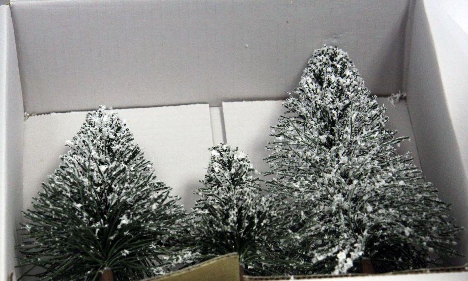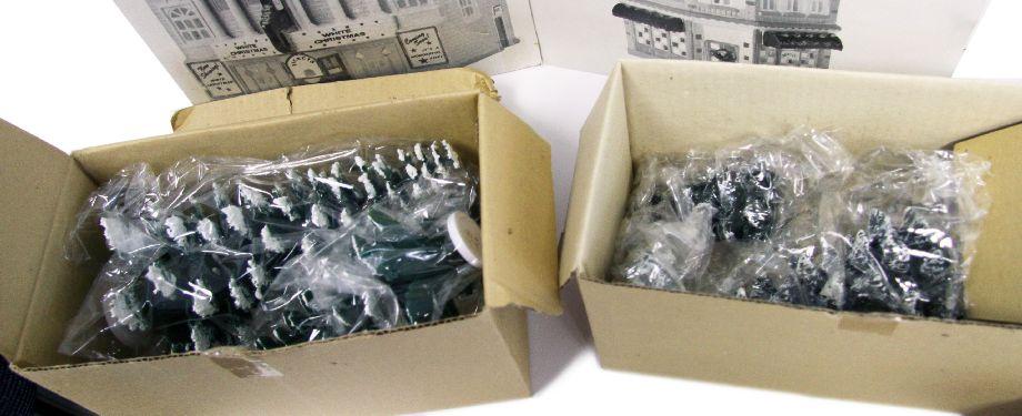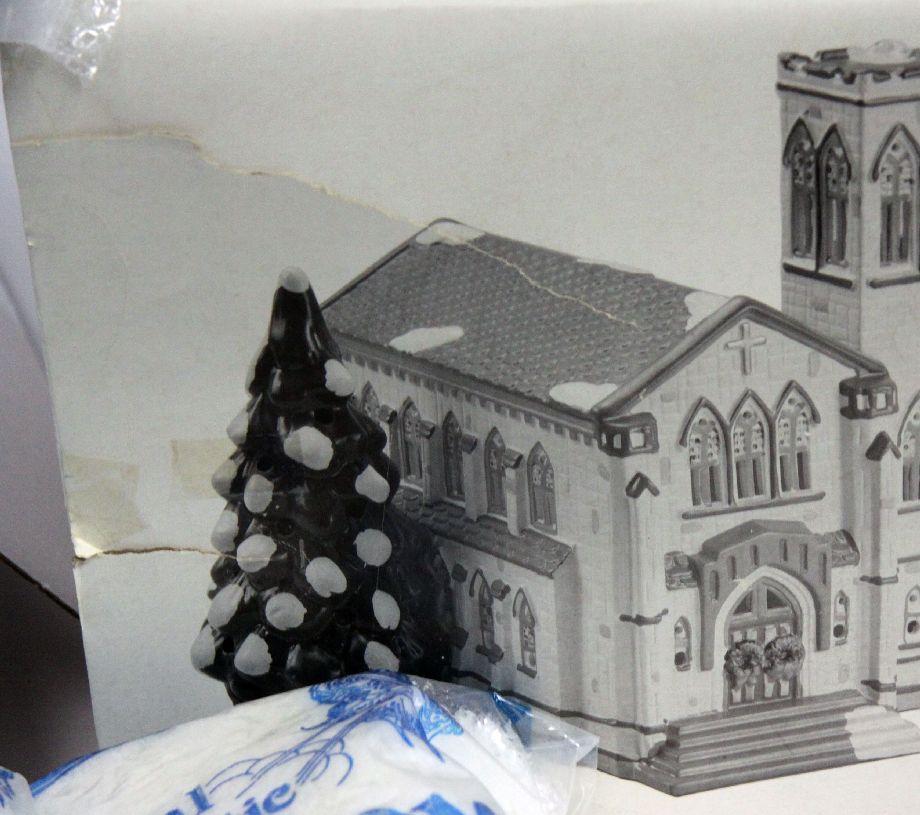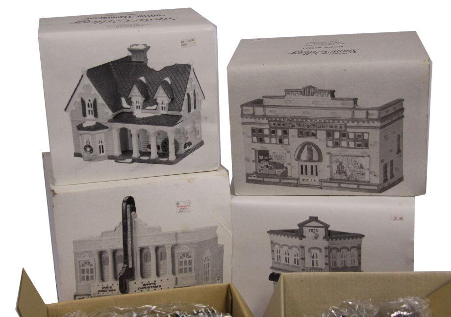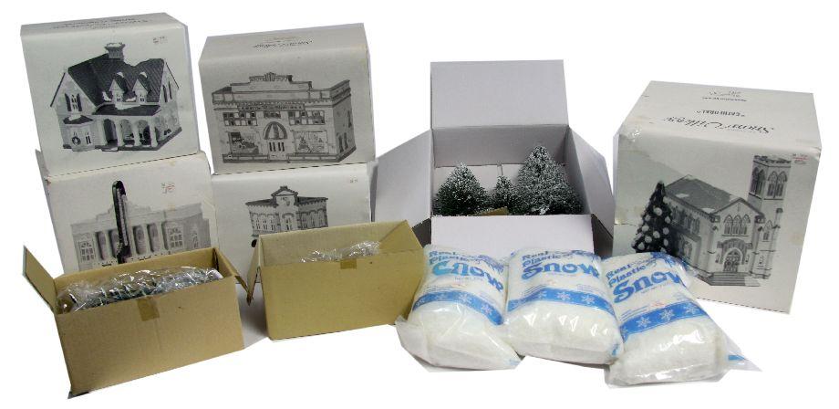 Grouping includes Gothic Farmhouse 5404-6, The Paramount Theater 5142-0, Bakery 5077-6, Village Market 5044-0, Box of Christmas Trees 5174-6, 2 boxes of Christmas Trees 6582-0, three Real Plastic Snow, Cathedral.