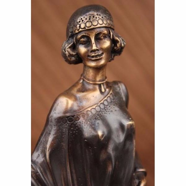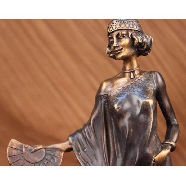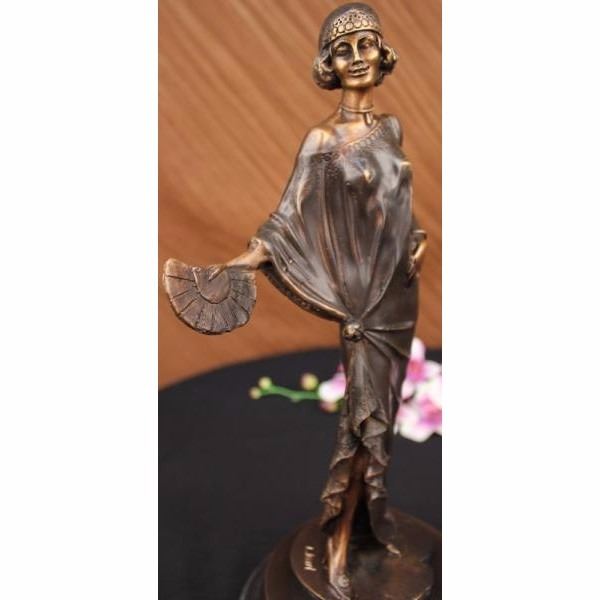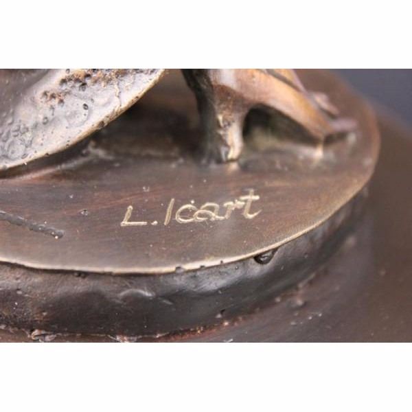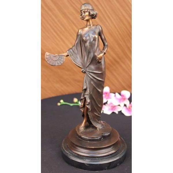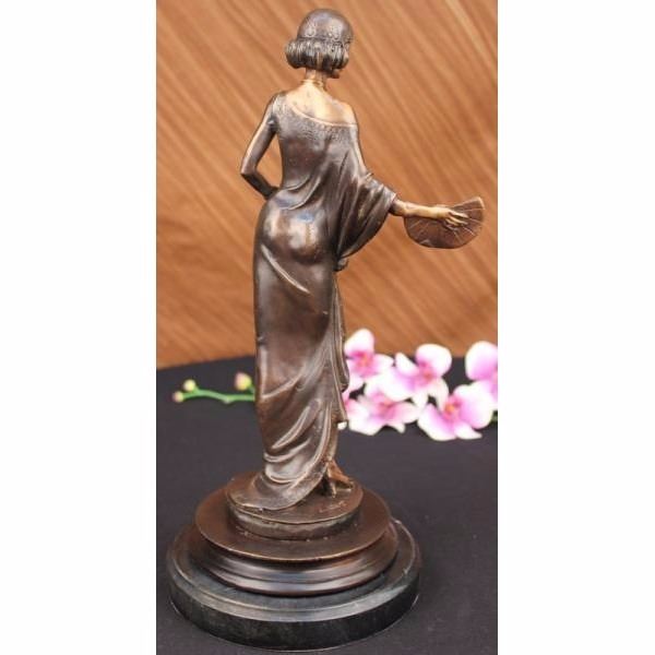 This is a remarkable sculpture depicting a woman of fashion and grace. She stands with a slight curve, one hand on her hip and the other clasping a spread fan. She wears a simple garment that has been customized to her liking. Theres a circular cut out that hangs slightly off one shoulder, one side of her arm is revealed and the other covered in fabric which is collected just below her waist and tied, leaving a curtain open to expose her lower leg a fancy shoe. Her hair is short and stylish and she wears a fitted cap over it. Both the hat and dress have a lower hem that is decorated with embroidery. She wears a bracelet and necklace that signifies her taste in style. Her face itself is distinguished and detailed with precision and grace. She is handmade using the Lost Wax Method and has a two tone brown patina. Signed L. Icart.Louis Justin Laurent Icart was born in Toulouse in 1890 and died in Paris in 1950. He did bronze sculptures and was also a painter that released several books of his artwork. He lived in New York City in the 1920s where he became known for his Art-Deco of glamorous woman. Condition : This sculpture is in perfect condition. Bronze Dimensions with Marble Base:Height 15" x Width 7" Marble Dimensions: Diameter 7" Height without base: 14" Weight :10 LBS Inventory : 2059300M4502