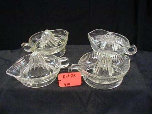 DEPRESSION CLEAR GLASS REAMERS, ALL FTD, TAB HANDLES, ASST. DESIGNS (1) HAS SM NICKING ON SPOUT, 4 PCS