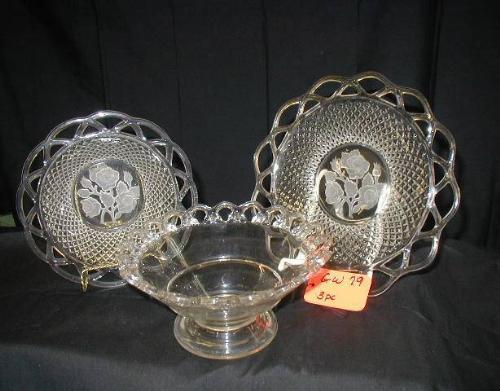 DEPRESSION CROCHET EDGE ROSE MOTIF 8in BOWL & MATCHING LINER 9 1/2in, FTD. IMPERIAL CROCHET EDGE CRYSTAL BOWL 8in,CROCHET EDGE PLATE, CROCHET EDGE BOWL, 5 PCS