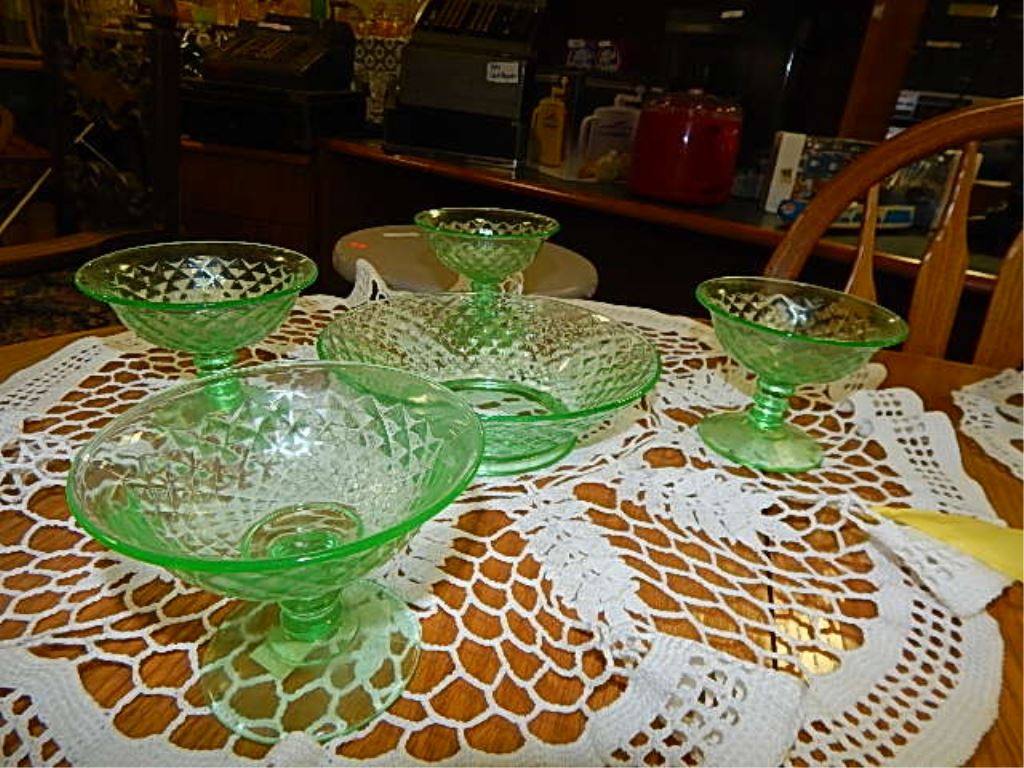 DEPRESSION GLASS - EMERALD GLASS -BOWL & 4 GLASSES -CRISSCROSS PATTERN