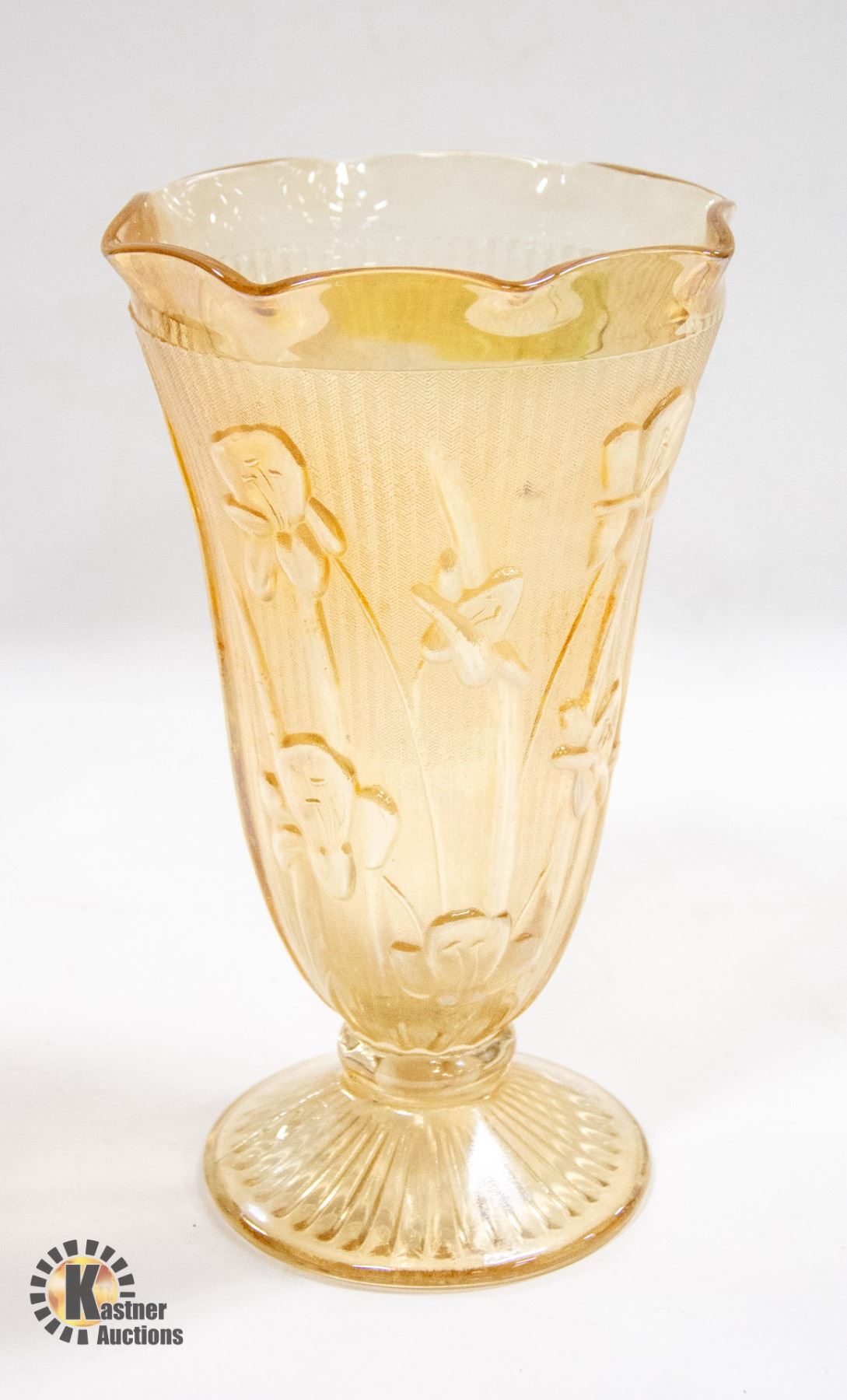 DEPRESSION GLASS IRIS AND HERRINGBONE TWEED VASE