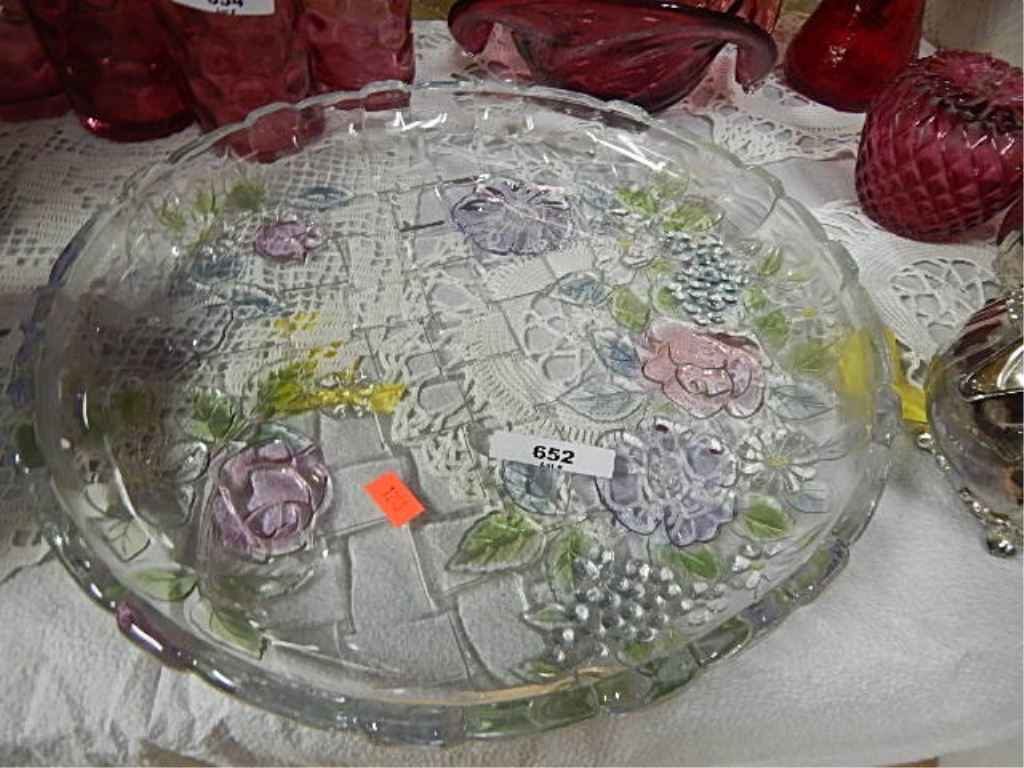 DEPRESSION GLASS PLATTER - CLEAR WITH COLORED FLOWERS