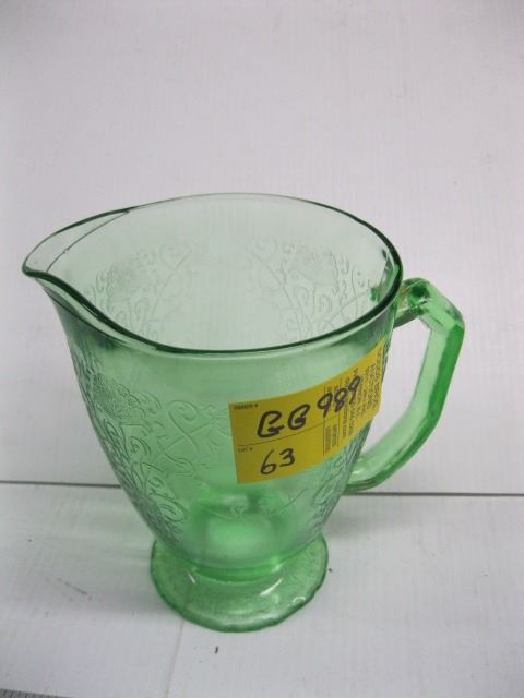 DEPRESSION GLASS WATER PITCHER, SOME CHIPS ON BOTTOM