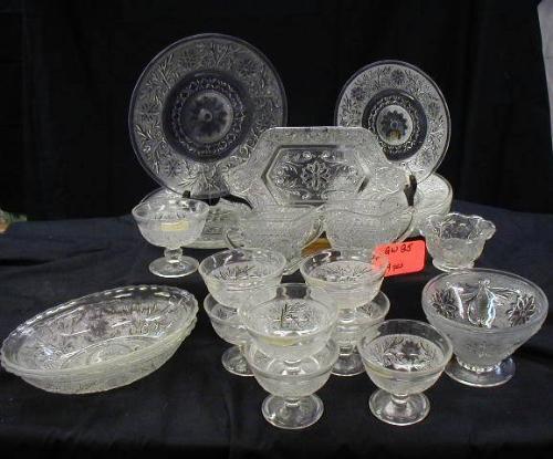 DEPRESSION SANDWICH PRESSED GLASS LOT INCLUDES (3) 9in PLATES, (8) 7in DESSERT, (8) SHERBERTS, (2) OVAL SERVING, DBL. HNDL.FTD. SUGAR & MATCHING CREAMER W/LINER TRAY, FTD. BOWL (W/SM CHIPS) & LOX SHERBERT, 26 PCS