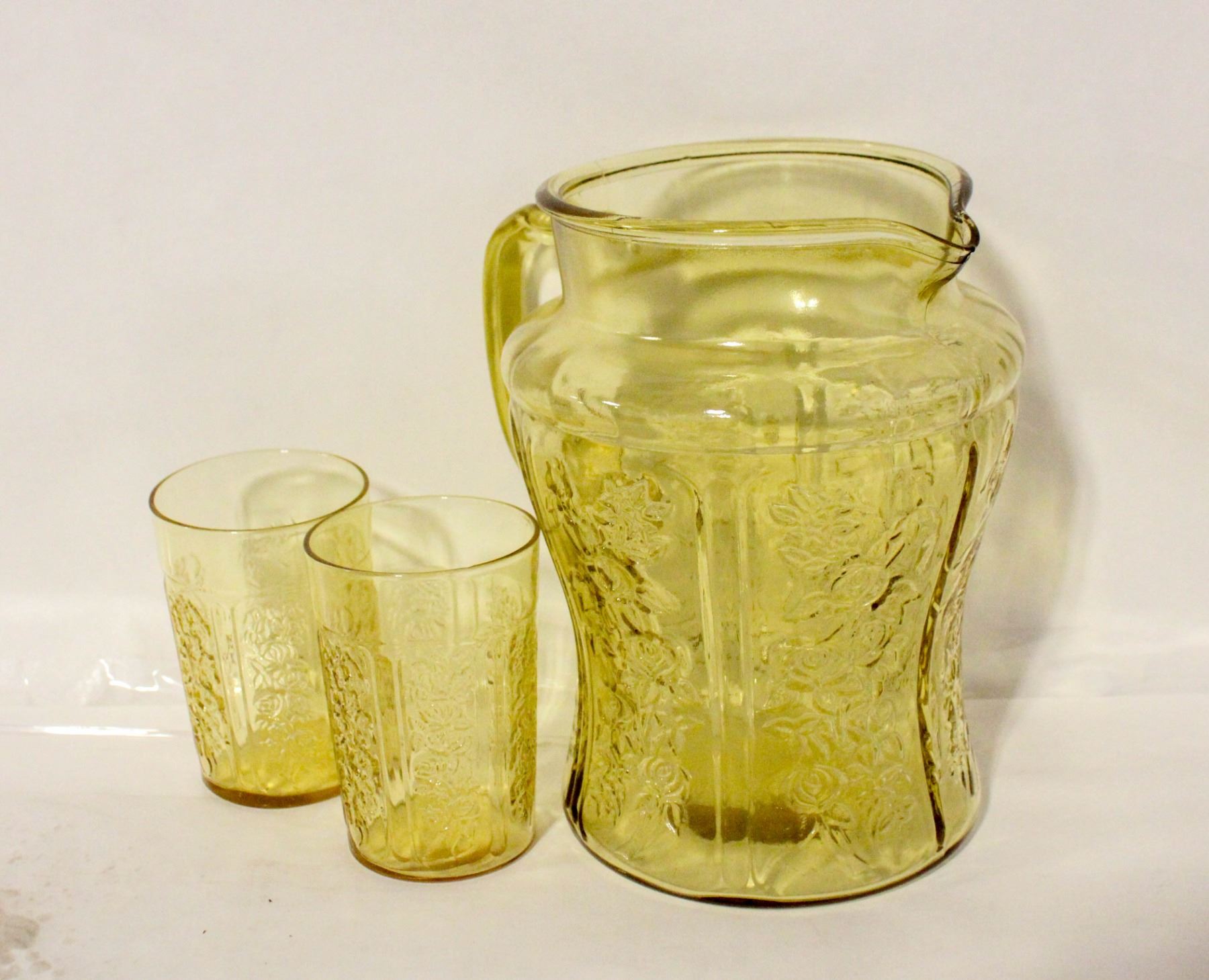 DEPRESSION VASELINE GLASS PITCHER & 2 CUPS