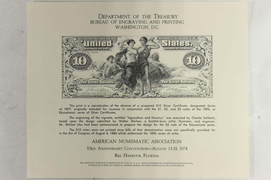 PRINT. REPRODUCTION OF THE OBV. OF A PROPOSED  $10 SILVER CERTIFICATE. AMERICAN NUMISMATIC  ASSOC. 83RD ANNIVERSARY COMVENTION AUGUST  13-18, 1974