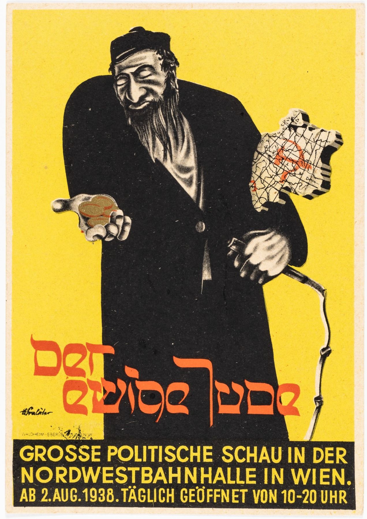 Original postcard advertising the 1938 German exhibition 'Der Ewige Jude' in Vienna organized by Joseph Goebbels. The postcard is stamped on the verso with an advertisement for the exhibition of the same name in Vienna. Dated 20.VIII.38. Approx. 4 x 6 inches.