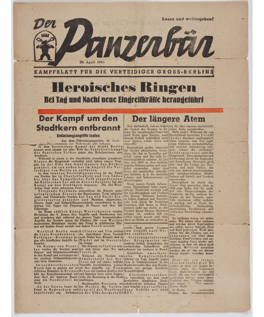 Very rare newspaper, "Der Panzerbaer", 4pp. large 4to., Berlin, Apr. 29, 1945. The paper only appeared seven times altogether between 23 and 29 April 1945. Its logo was a bear, referring to the coat of arms of Berlin, holding a Panzerfaust anti-tank weapon. It reported on and provided Nazi propaganda regarding the fight for the city against the Soviet Red Army. This issue, published the day before Adolf Hitler would commit suicide, bears a headline reading: "Heroic Wrestling by Day and Night New Defensive Forces Are Being Introduced". The text describes the fighting for the inner city of Berlin, the advance by the Americans from the Elbe, and intense Soviet pressure. The bad news is offered in as an upbeat manner as possible, yet still dwells on the "chains" of Versailles and claims that Britain and the U.S. were always ready to sell-out smaller nations to Stalin. Also: "...We have nothing to lose any more, we have lost everything...if we capitulate, we give up our future, our children, our wives...Where the Fuhrer is, there is the victory...where is the enemy, where is the friend - nobody knows...Ivan is coming from the north...Stalin wants Berlin, nothing else counts...Berlin, don't let Ivan in...". Two photos appear, showing a young boy with a panzerfaust and women handing food out to soldiers. Toned with fold splits, no loss, still very good and undoubtedly not a reprint. Possibly the rarest of all war era papers and it is simply incomprehensible to understand how it could have been published under non-stop artillery bombardment and infantry attacks throughout the city.