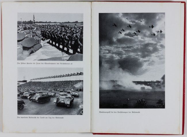 "Der Parteitag der Freiheit" ["The Party Day of Freedom"] (Munich: Zentralverlag der NSDAP., Franz Eher Nachf.), 1936, 320pp. 8vo., a comprehensive collection of speeches, photographs, and narratives from the 1935 National Party Convention at Nuremberg. Bound in red leather boards. The binding is split at the title page and among the photo plates near the back, with some foxing on the back pages, else very good. Our consignor's father was the chief of staff, American Headquarters, Berlin Air Command from June to August, 1945. During this period, he had the opportunity to "liberate" several volumes from the Reichschancellery, specifically Hitler's offices and those adjoining. This example is one of those volumes. With a copy of the consignor's notarized letter of provenance.