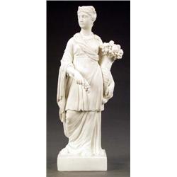 A Derby biscuit 'Antique Figure of Plenty', holding a cornucopia of fruit, on square base, 9.75in high, incised with crown, crossed batons, D and no. 163 large (See: Peter Bradshaw, Derby Porcelain Figures 1750-1840, illus 231)