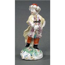 A Derby figure of a boy, in Turkish costume, his turban with iron red crown, yellow gown and floral jacket, on scroll base, 3.75in high, no. 63 but unmarked, c.1765 (See: F. Brayshaw Gilhespy, Crown Derby Porcelain, fig. 100)