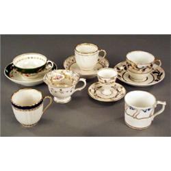 A Derby tea cup and saucer, the dark green border with pink and gilt flowers; a fluted cup; another cup and saucer, three other cups; a saucer and an egg cup, puce, red and gilt marks (10)