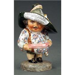 DERBY AND ASSOCIATED FACTORIES - A Royal Crown Derby Mansion House dwarf A Royal Crown Derby Mansion House dwarf, standing, his hands on his belt wearing a broad brimmed hat advertising the Auction of Elegant Household Furniture, wearing floral waistcoat, pink sash and breeches, 7in high, printed mark in red, modern