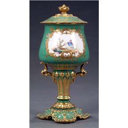 A Royal Crown Derby vase and cover, painted with a bird in a gilt scroll reserve on an apple green ground, the base and foot moulded and gilt, 8.5in high, date code for 1897