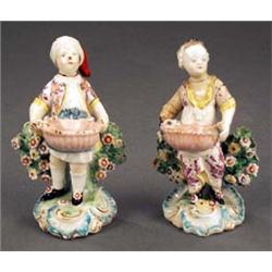DERBY AND ASSOCIATED FACTORIES - A pair of Derby patch mark figures A pair of Derby patch mark figures, both standing holding baskets before bocage, he with red cloth hat, floral jacket and blue apron, she with cloth bonnet and floral dress, shaped scrolled bases picked out in turquoise and gilt, 4.25in high, c.1770 (both with faults)