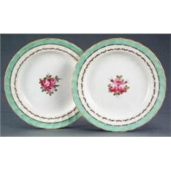 A pair of Derby plates, painted with spray of three pink roses, the fluted apple green border flanked by plain gilt lines and with inner border of gilt laurel, 9in diam, marked with crown, crossed batons, D and pattern 232 in puce (one with minor chip to underside)