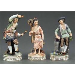 DERBY AND ASSOCIATED FACTORIES - A set of three Royal Crown Derby figures A set of three Royal Crown Derby figures, The Elements, Water stands barefoot holding a fishing net in her right hand and securing a catch of fish in her folded skirt; Earth, a gardener stands leaning against a spade wearing broad brimmed hat and striped shirt holding a cabbage and bunch of grapes; Fire, stands wearing broad brimmed hat, waistcoat and breeches holding aloft in his left hand a torch, a faggot in his right hand, each on canted square and Greek key bases, approx 7.25in high, printed marks, modern